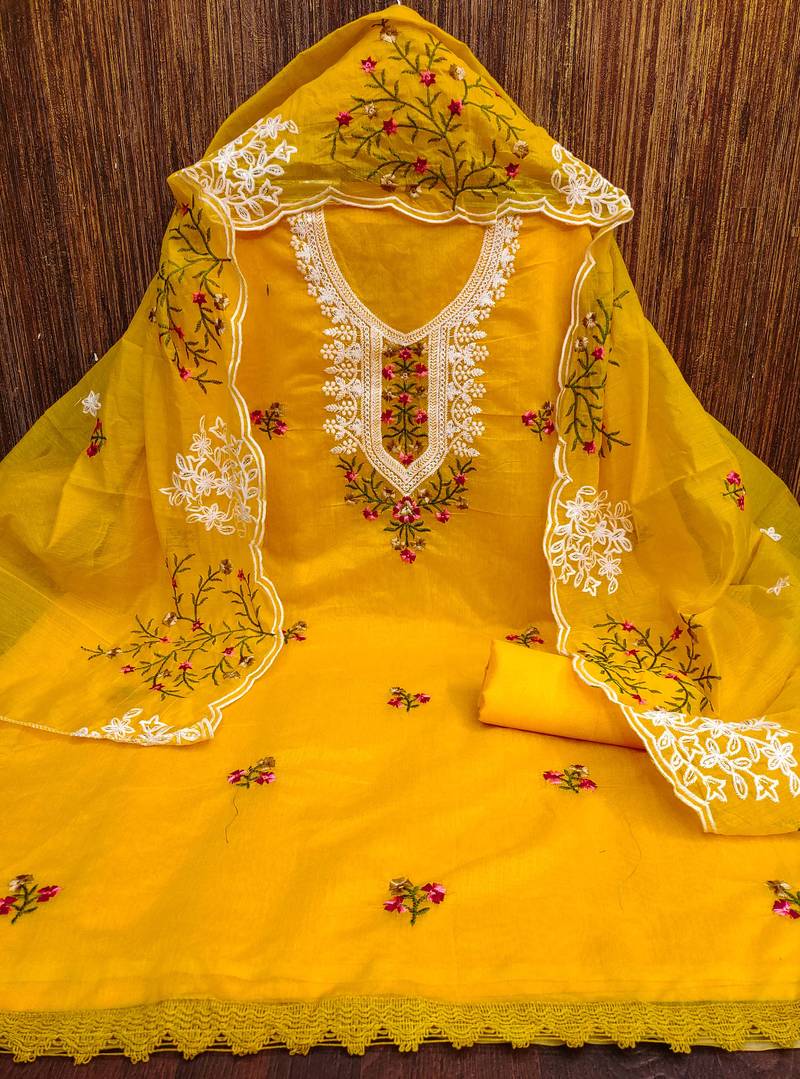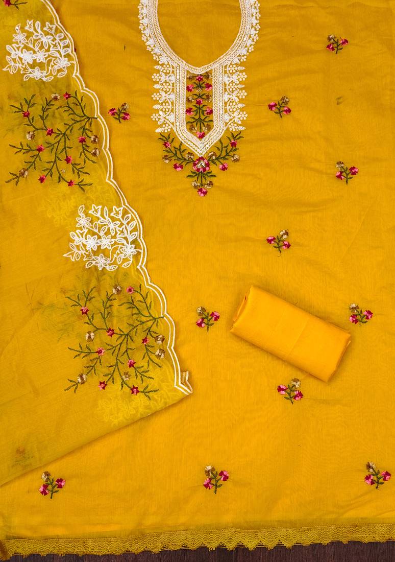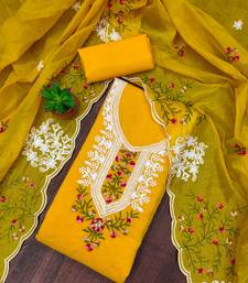 Mustard cotton embroidered dress material unstitched
