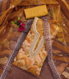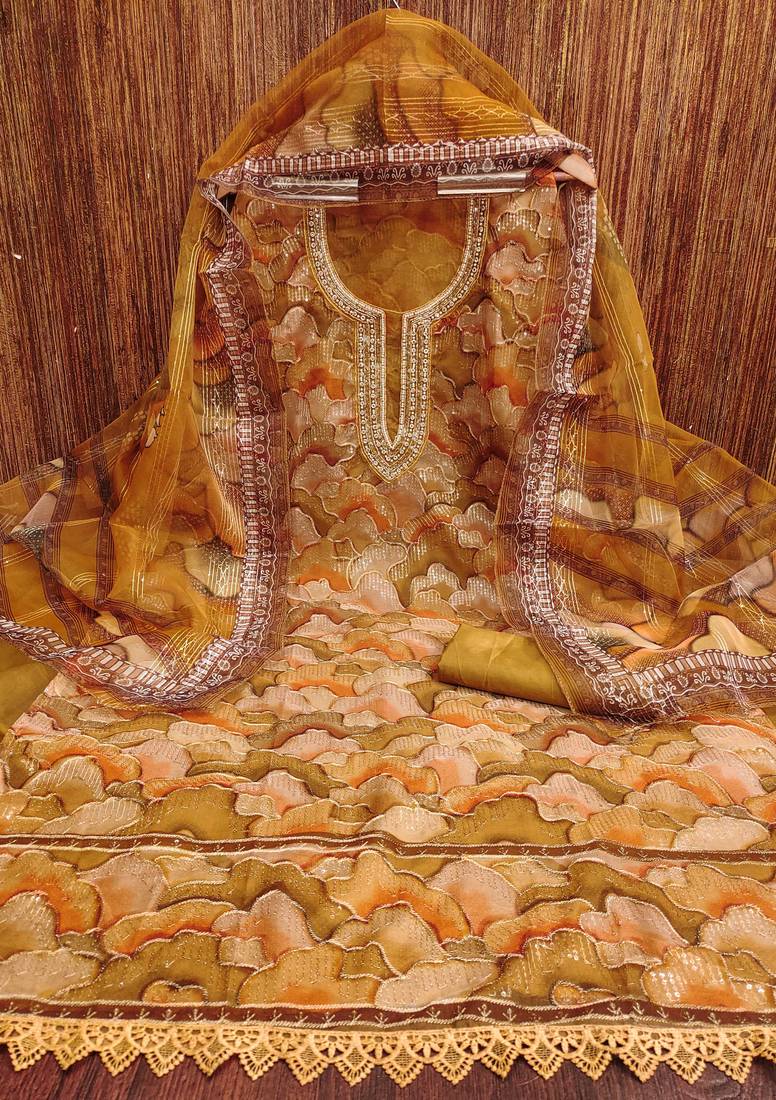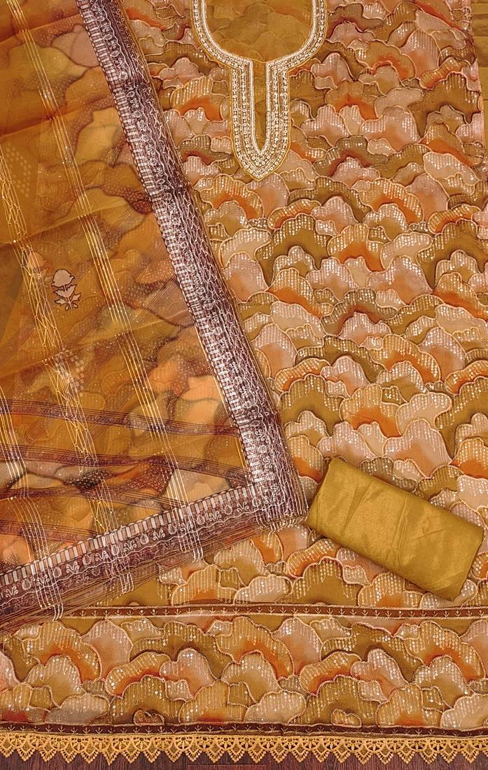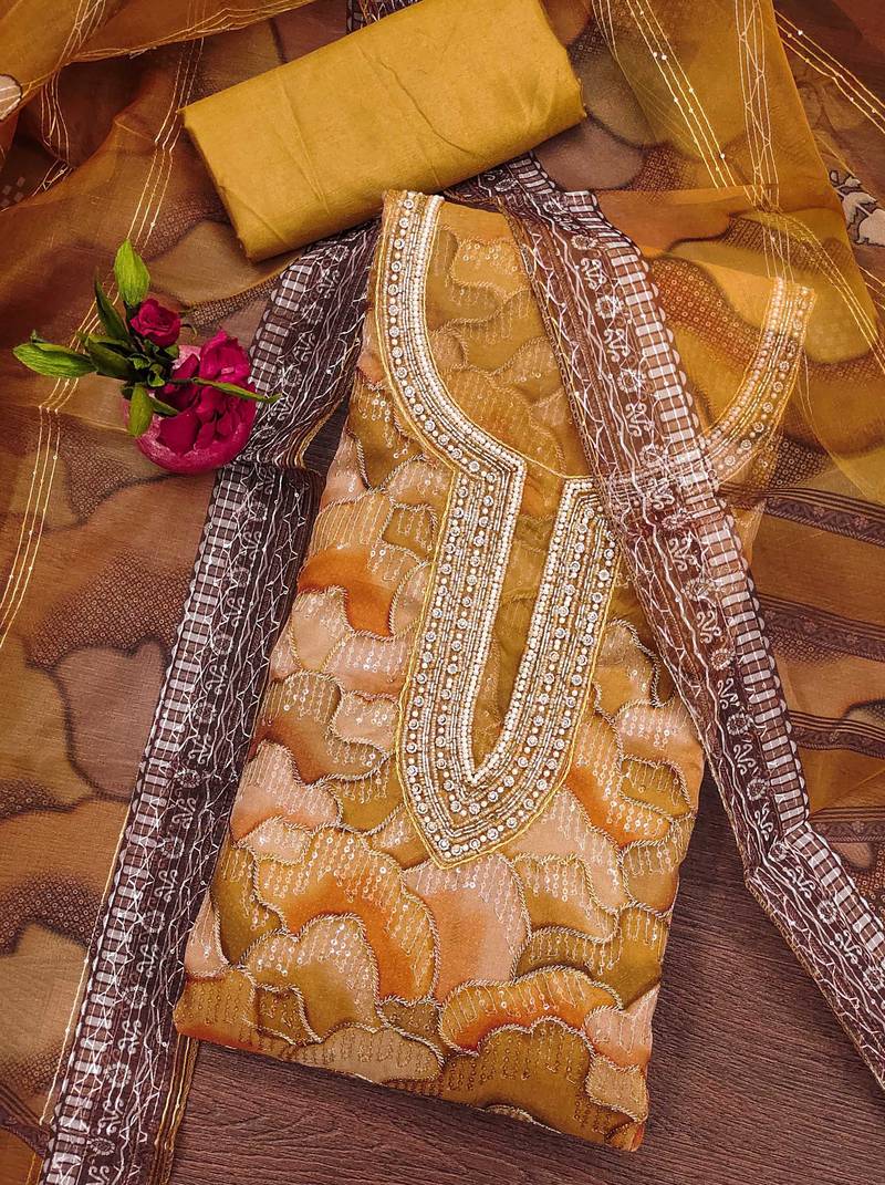 Mustard organza sequins dress material unstitched