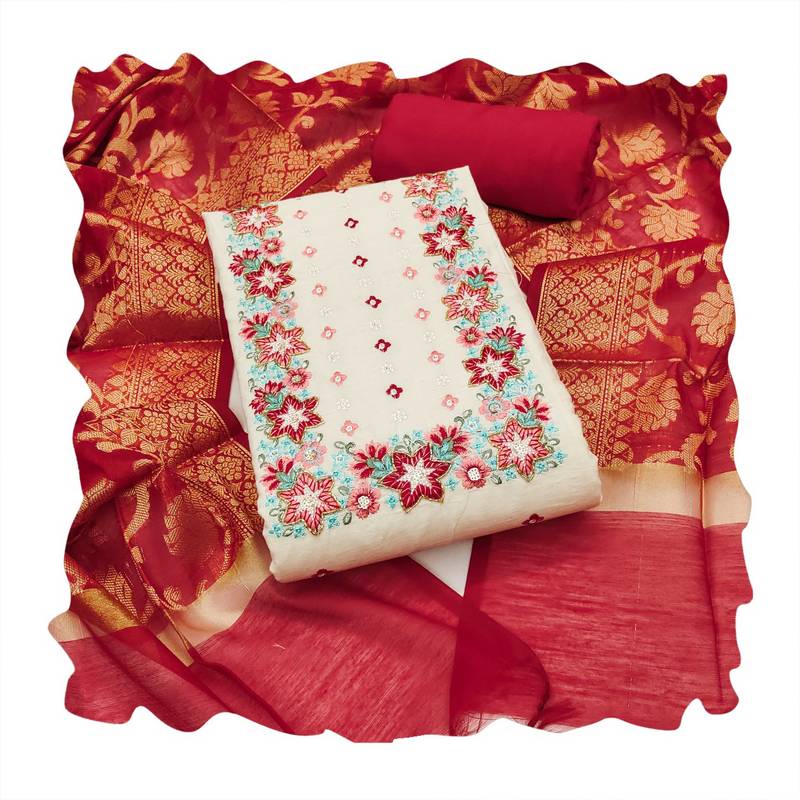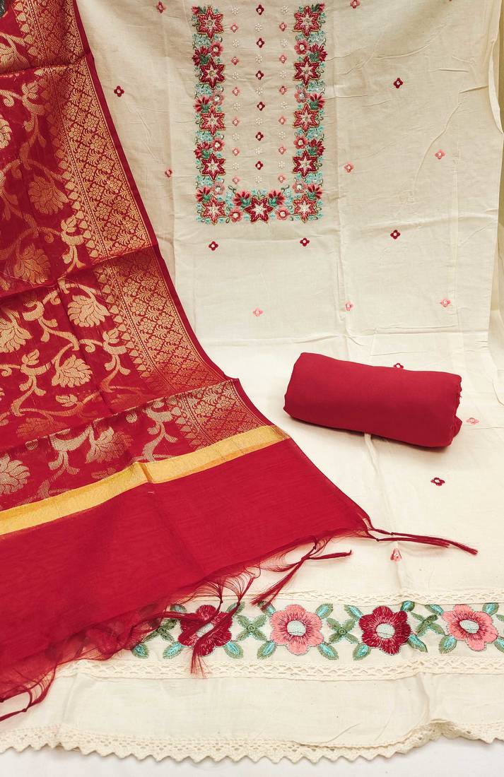 | Product Description | Festive Ready Heavy Thread Embroidery Handwork And Fancy Border With Designer Woven Dupatta Straight Style 2.20 Mtr Unstitched Dress Material Top Of Off White Colour Pure Cotton Fabric Also Including 2.40 Mtr Chudidar Style Bottom Piece Material Of Maroon Colour Rayon Fabric With 2.10 Mtr Dupatta Of Maroon Colour Banarasi Fabric By Shadow & Saining Brand |