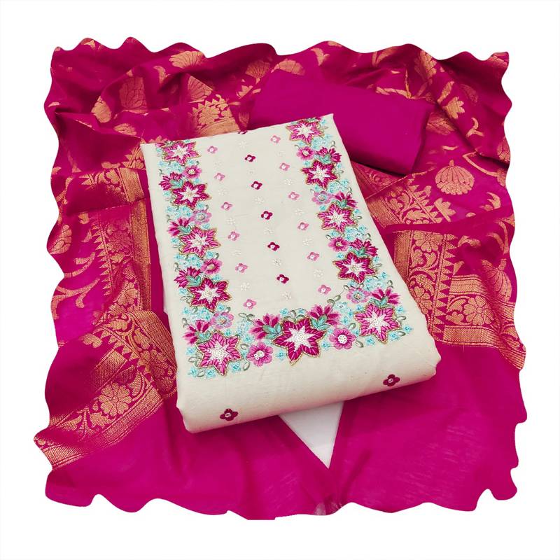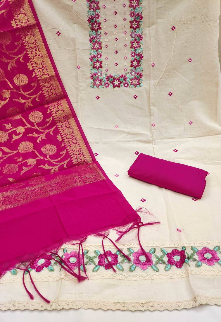 | Product Description | Minimal Heavy Thread Embroidery Handwork And Fancy Border With Designer Woven Dupatta Straight Style 2.20 Mtr Unstitched Dress Material Top Of Off White Colour Pure Cotton Fabric Also Including 2.40 Mtr Chudidar Style Bottom Piece Material Of Pink Colour Rayon Fabric With 2.10 Mtr Dupatta Of Pink Colour Banarasi Fabric By Shadow & Saining Brand |
