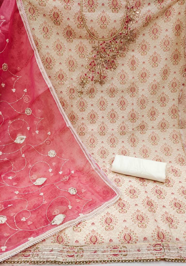 | Product Description | Print Handwork And Fancy Border With Embroidered Dupatta Straight Style 2.00 Mtr Unstitched Dress Material Top Of Off White Colour Modal Cotton Fabric With 2 Mtr Santoon As Lining Inner Fabric Also Including 3.80 Mtr Unstitched Bottom Material Of Off White Colour Santoon Fabric With 2.00 Mtr Dupatta Of Red Colour Organza Fabric |