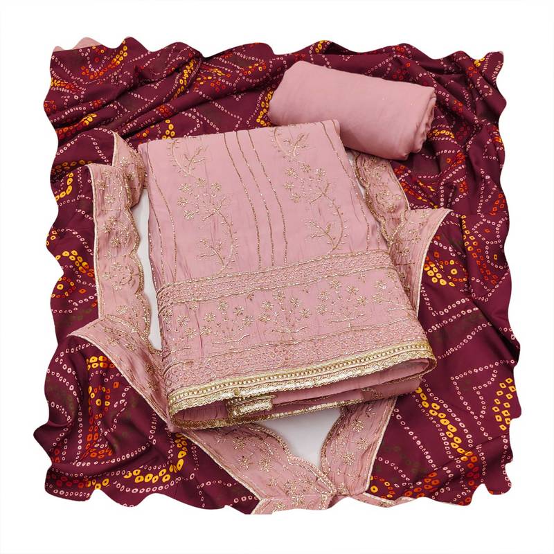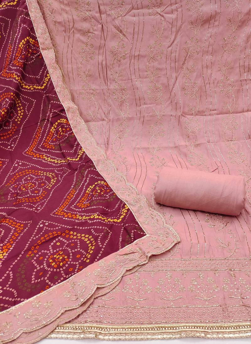 | Product Description | Trendsetting Heavy Thread Handwork Embroidery And Fancy Border With Designer Bandhani Printed Dupatta Straight Style 2.20 Mtr Unstitched Dress Material Top Of Peach Colour Premium Roman Cotton Fabric Also Including 2.40 Mtr Chudidar Style Bottom Piece Material Of Peach Colour Rayon Fabric With 2.10 Mtr Dupatta Of Maroon Colour Muslin Fabric By Shadow & Saining Brand |