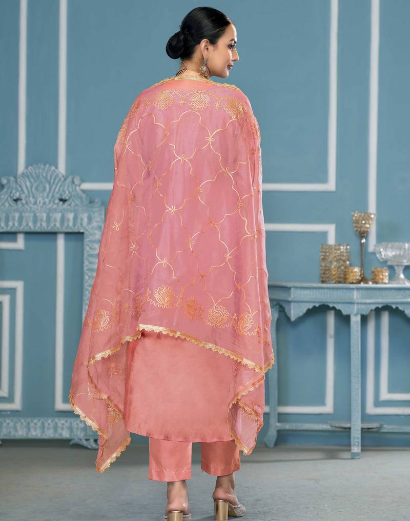 | Product Description | Opulent Heavy Gota Embroidery Daimond Work And Fancy Border With Embroidered Dupatta Straight Style 2.00 Mtr Unstitched Dress Material Top Of Peach Colour Roman Cotton Silk Fabric Also Including 2.40 Mtr Chudidar Style Bottom Piece Material Of Peach Colour Dull Santoon Fabric With 2.10 Mtr Dupatta Of Peach Colour Nazneen Fabric By Shadow & Saining Brand |