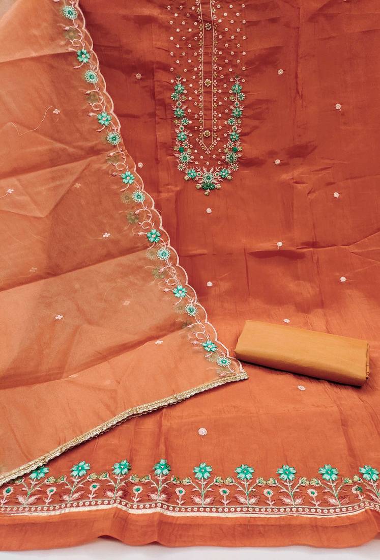 Graceful Heavy Multi Thread Embroidery And Fancy Border With Designer Embroidered Dupatta Straight Style 2.00 Mtr Unstitched Dress Material Top Of Peach Colour Viscose Golden Crush Fabric With 2 Mtr Dull Santoon As Lining Inner Fabric Also Including 3.70 Mtr Unstiched Bottom Material Of Peach Colour Dull Santoon Fabric With 2.10 Mtr Dupatta Of Peach Colour Pure Organja Fabric By Shadow & Saining Brand