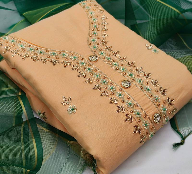 peach chanderi hand embroidery dress material
