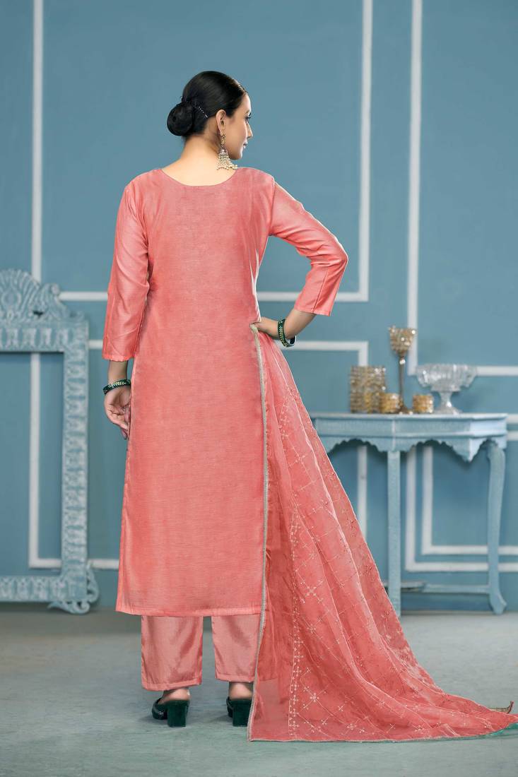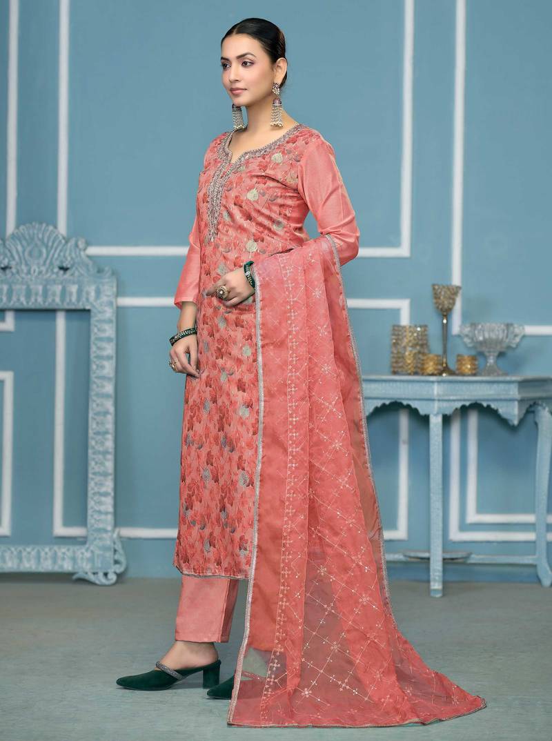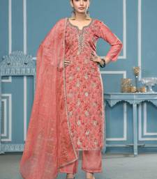 Peach hand embroidery organza semi stitched churidar dress-materials