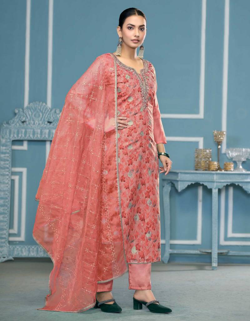 | Product Name | Peach Hand Embroidery Organza Semi Stitched Churidar Dress Materials | |