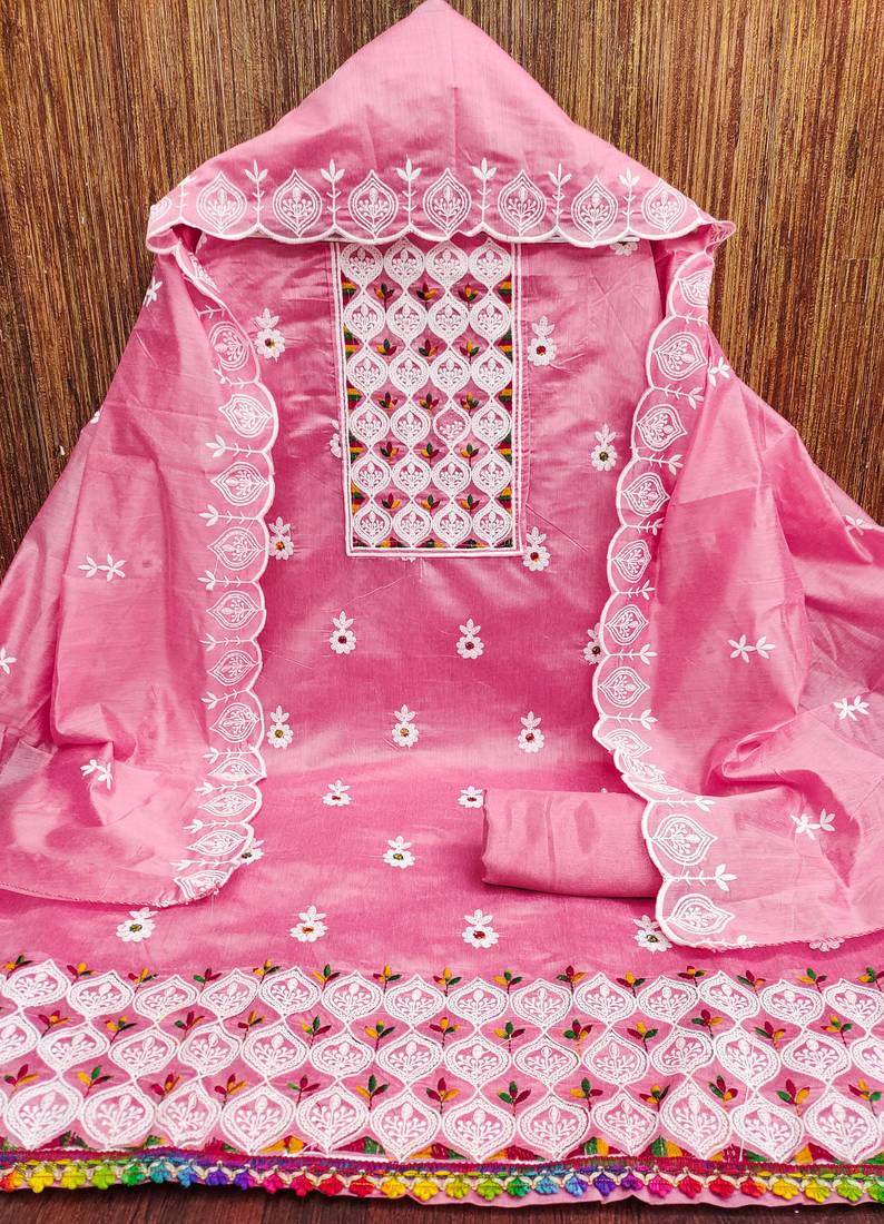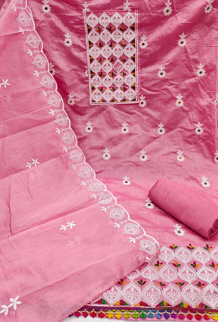 Preety Heavy Thread Embroidery And Fancy Border With Designer Embroidered Dupatta Straight Style 1.80 Mtr Unstitched Dress Material Top Of Pink Colour Chanderi Cotton Fabric With 2 Mtr Santoon As Lining Inner Fabric Also Including 3.60 Mtr Unstiched Bottom Material Of Pink Colour Santoon Fabric With 2.10 Mtr Dupatta Of Pink Colour Chanderi Cotton Fabric By Shadow & Saining Brand