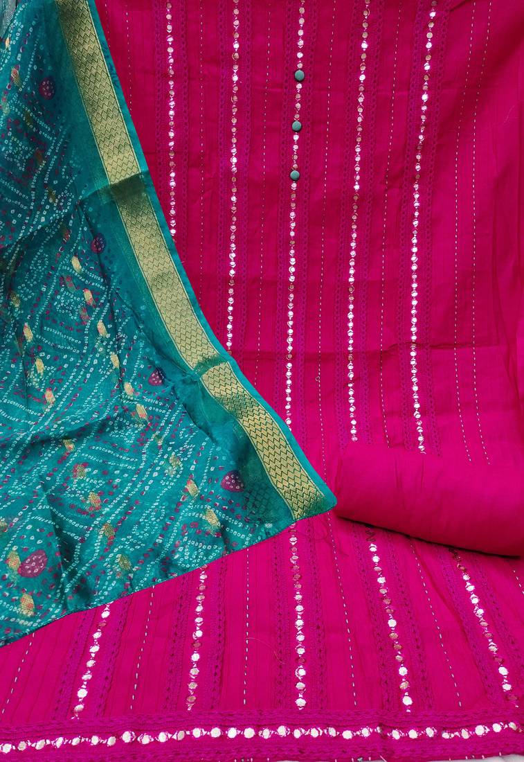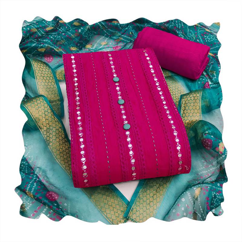 | Product Description | Contemporary Heavy Thread Embroidery And Fancy Border With Designer Bandhani Printed Dupatta Straight Style 2.20 Mtr Unstitched Dress Material Top Of Pink Colour Premium Roman Cotton Fabric Also Including 2.40 Mtr Chudidar Style Bottom Piece Material Of Pink Colour Rayon Fabric With 2.10 Mtr Dupatta Of Pink Colour Banarasi Fabric By Shadow & Saining Brand |