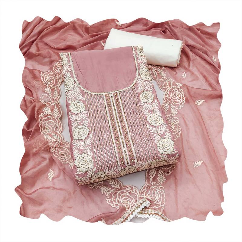 | Product Description | Exclusive Heavy Thread Handwork Embroidery And Fancy Border With Designer Embroidered Dupatta Straight Style 2.20 Mtr Unstitched Dress Material Top Of Pink Colour Premium Roman Cotton Fabric Also Including 2.40 Mtr Chudidar Style Bottom Piece Material Of White Colour Rayon Fabric With 2.10 Mtr Dupatta Of Pink Colour Nazneen Fabric By Shadow & Saining Brand |