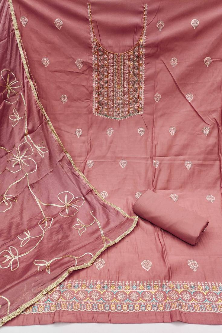 | Product Description | Opulent Heavy Thread Sequence Embroidery, Stylish Handwork And Fancy Border With Gota Embroidered Dupatta Straight Style 2.00 Mtr Unstitched Dress Material Top Of Pink Colour Roamn Cotton Fabric Also Including 2.40 Mtr Chudidar Style Bottom Piece Material Of Pink Colour Dull Santoon Fabric With 2.10 Mtr Dupatta Of Pink Colour Nazneen Fabric By Shadow & Saining Brand |