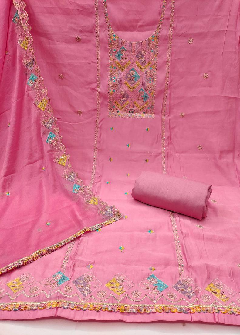 Minimal Heavy Thread Sequence Embroidery And Fancy Border With Designer Embroidered Dupatta Straight Style 2.20 Mtr Unstitched Dress Material Top Of Pink Colour Pure Cotton Silk Fabric Also Including 2.40 Mtr Chudidar Style Bottom Piece Material Of Pink Colour Rayon Fabric With 2.10 Mtr Dupatta Of Pink Colour Nazneen Fabric By Shadow & Saining Brand