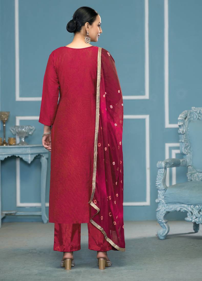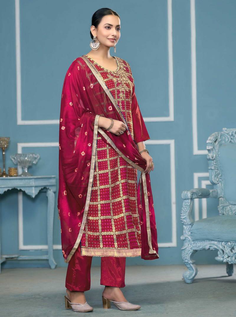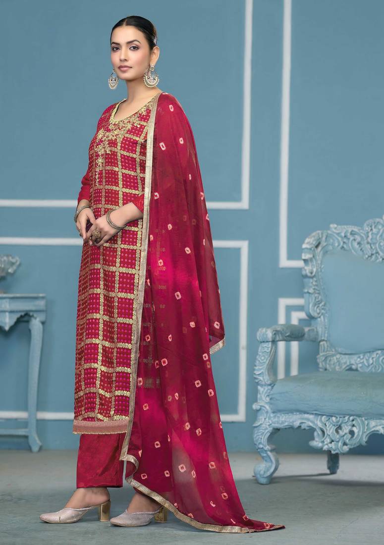 | Product Description | Ready To Ship Designer Weaving, Bandhani Print And Fancy Border With Stylish Printed Dupatta Straight Style 2.00 Mtr Unstitched Dress Material Top Of Pink Colour Banarasi Cotton Silk Fabric With 2 Mtr Dull Santoon As Lining Inner Fabric Also Including 2.40 Mtr Unstiched Bottom Material Of Pink Colour Dull Santoon Fabric With 2.10 Mtr Dupatta Of Pink Colour Cotton Silk Fabric By Shadow & Saining Brand |