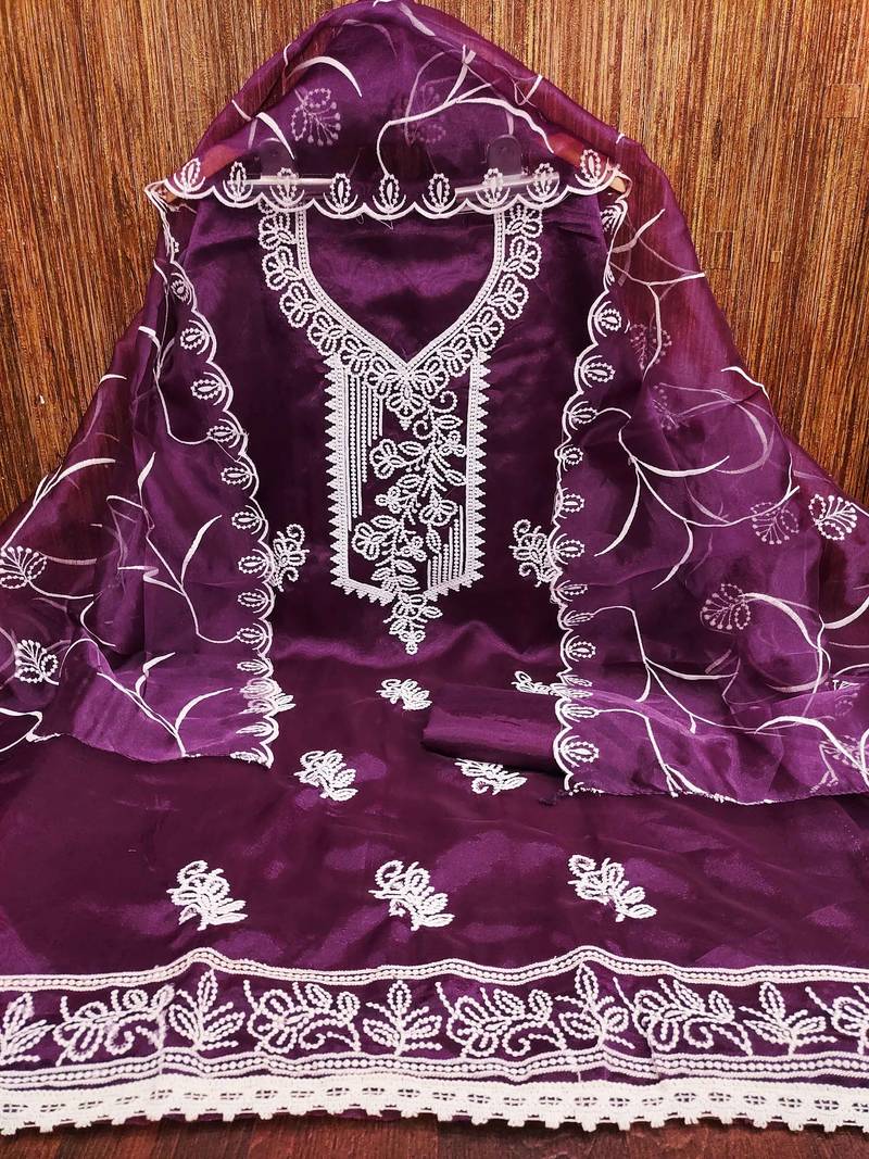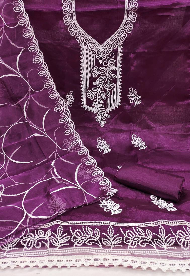 Product Name Purple Embroidered Organza Semi Stitched Churidar Dress Materials