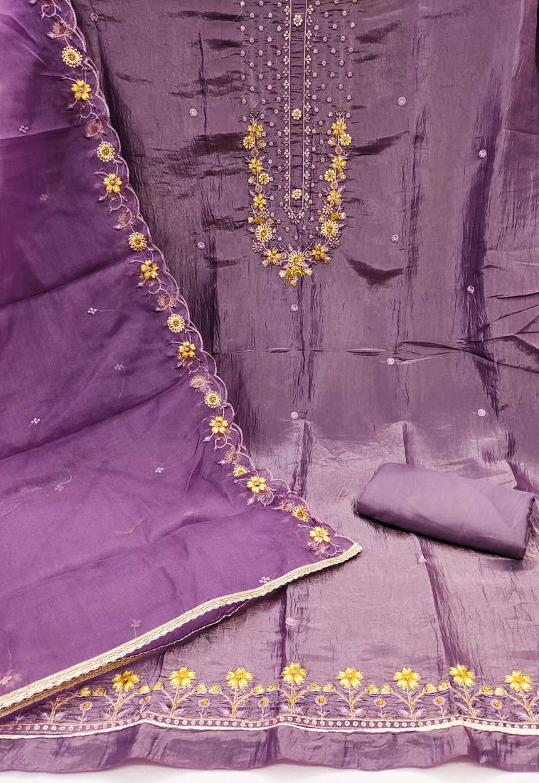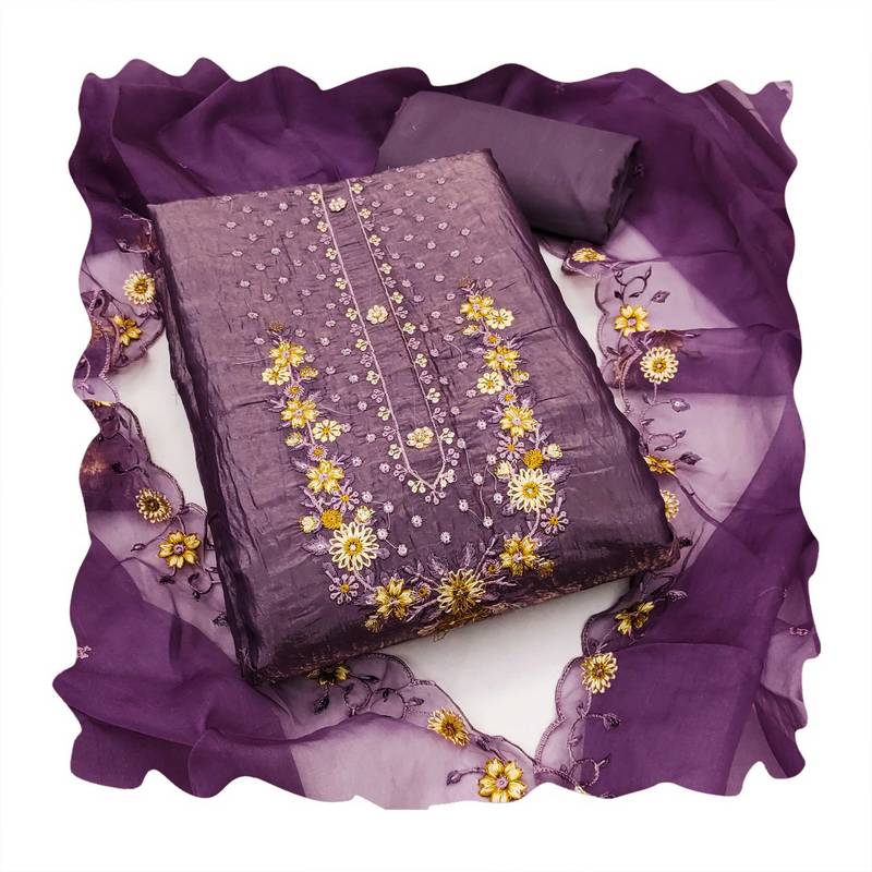 Artisanal Heavy Multi Thread Embroidery And Fancy Border With Designer Embroidered Dupatta Straight Style 2.00 Mtr Unstitched Dress Material Top Of Purple Colour Viscose Golden Crush Fabric With 2 Mtr Dull Santoon As Lining Inner Fabric Also Including 3.70 Mtr Unstiched Bottom Material Of Purple Colour Dull Santoon Fabric With 2.10 Mtr Dupatta Of Purple Colour Pure Organja Fabric By Shadow & Saining Brand