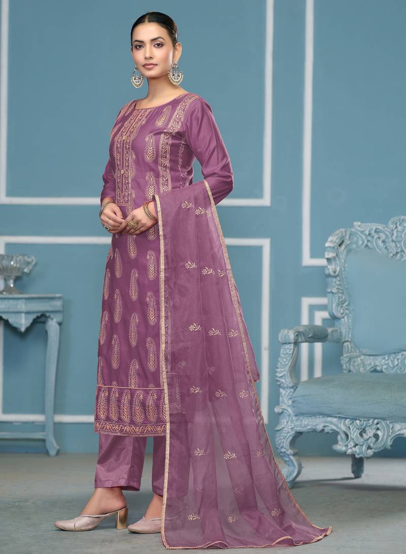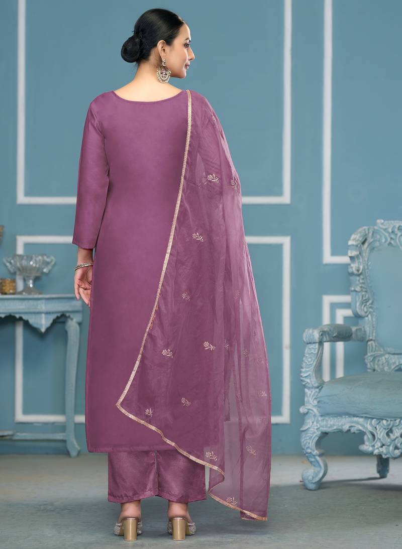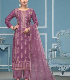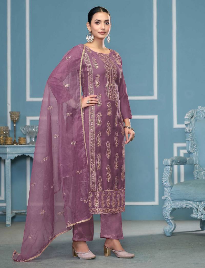 Trendsetting Heavy Thread Sequence Embroidery And Fancy Border With Embroidered Dupatta Straight Style 2.10 Mtr Unstitched Dress Material Top Of Purple Colour Roman Cotton Silk Fabric Also Including 2.40 Mtr Chudidar Style Bottom Piece Material Of Purple Colour Dull Santoon Fabric With 2.10 Mtr Dupatta Of Purple Colour Organza Fabric By Shadow & Saining Brand