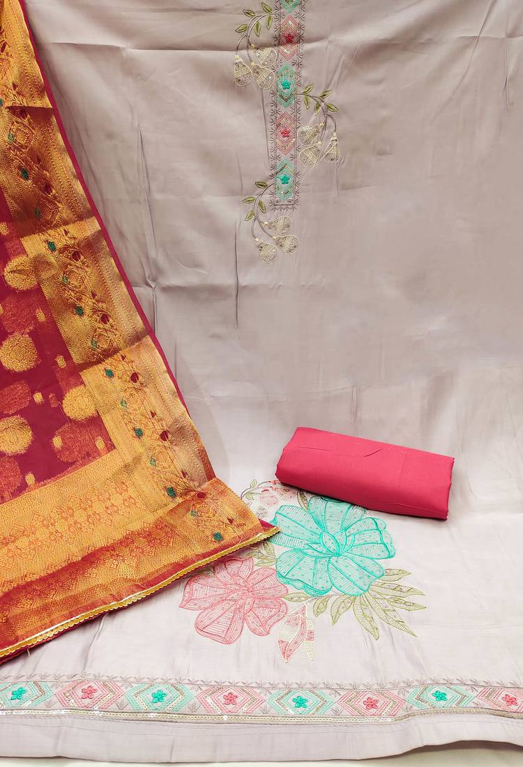 | Product Description | Heavy Thread Sequin Embroidery And Fancy Border With Banarasi Dupatta Straight Style 2.00 Mtr Unstitched Dress Material Top Of Purple Colour Roman Silk Fabric Also Including 2.40 Mtr Chudidar Style Bottom Piece Material Of Pink Colour Pure Cotton Fabric With 2.05 Mtr Dupatta Of Pink Colour Organza Banarasi Fabric |