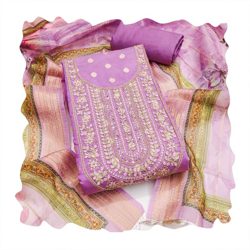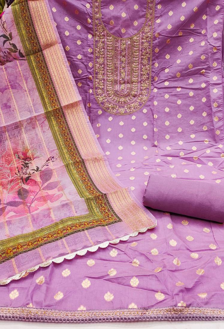 | Product Description | Handcrafted Designer Weaving Handwork And Fancy Border With Stylish Digital Printed Dupatta Straight Style 2.00 Mtr Unstitched Dress Material Top Of Purple Colour Banarasi Fabric Also Including 2.40 Mtr Chudidar Style Bottom Piece Material Of Purple Colour Rayon Fabric With 2.10 Mtr Dupatta Of Purple Colour Soft Chanderi Fabric By Shadow & Saining Brand |