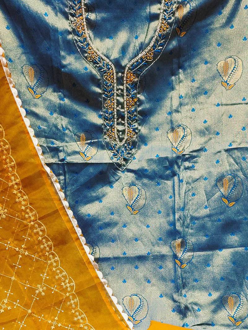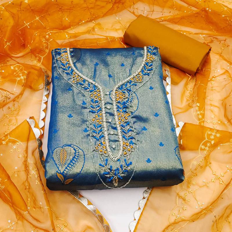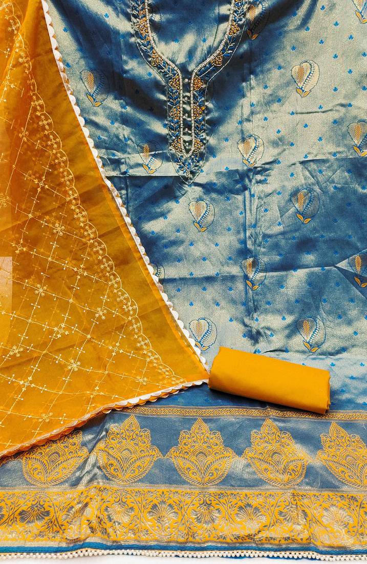 | Product Description | Weaving And Handwork With Embroidered Dupatta Straight Style 2.00 Mtr Unstitched Dress Material Top Of Royal Blue Colour Simmar Banarasi Jacquard Fabric Also Including 2.20 Mtr Chudidar Style Bottom Piece Material Of Royal Blue Colour Cotton Fabric With 2.00 Mtr Dupatta Of Mustered Colour Nazneen Fabric |