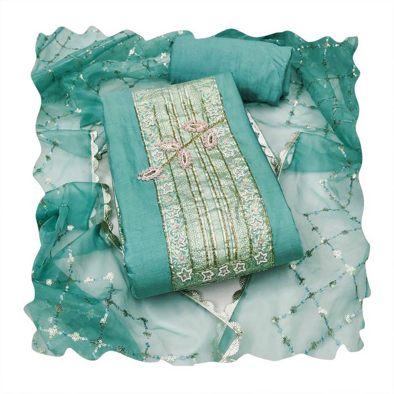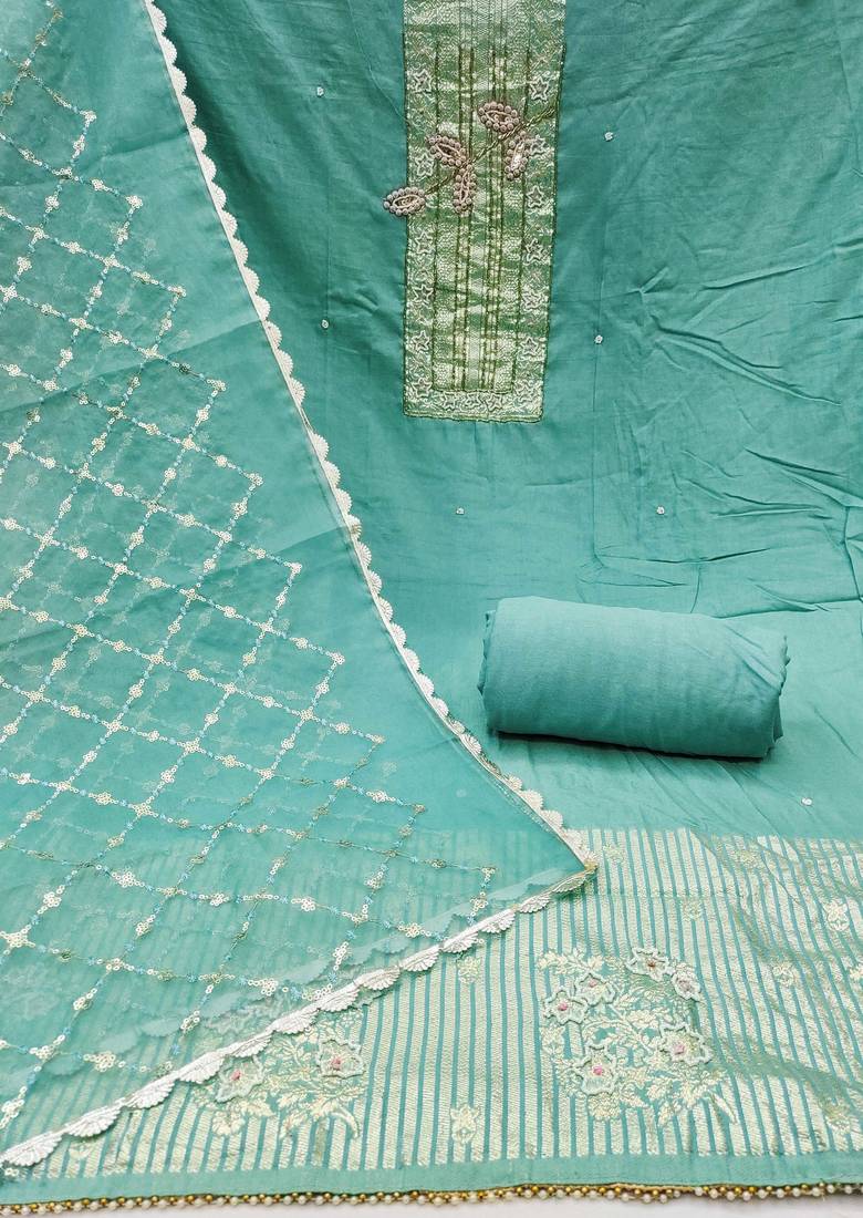 Party Perfect Heavy Handwork And Fancy Border With Designer Embroidered Dupatta Straight Style 2.00 Mtr Unstitched Dress Material Top Of Sea Green Colour Pure Cotton Banarasi Fabric Also Including 2.40 Mtr Chudidar Style Bottom Piece Material Of Sea Green Colour Rayon Fabric With 2.10 Mtr Dupatta Of Sea Green Colour Organja Fabric By Shadow & Saining Brand