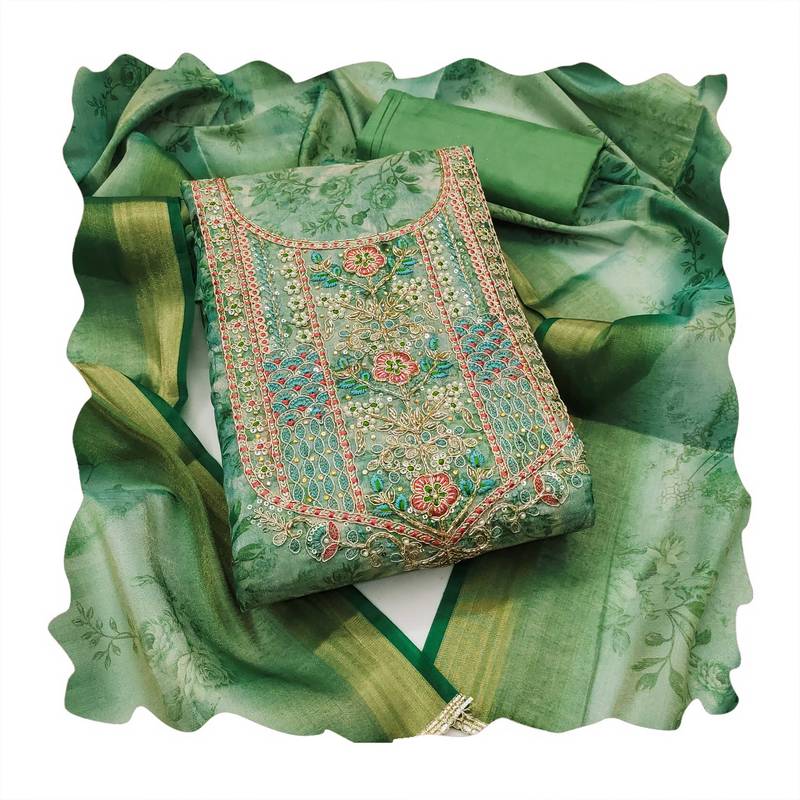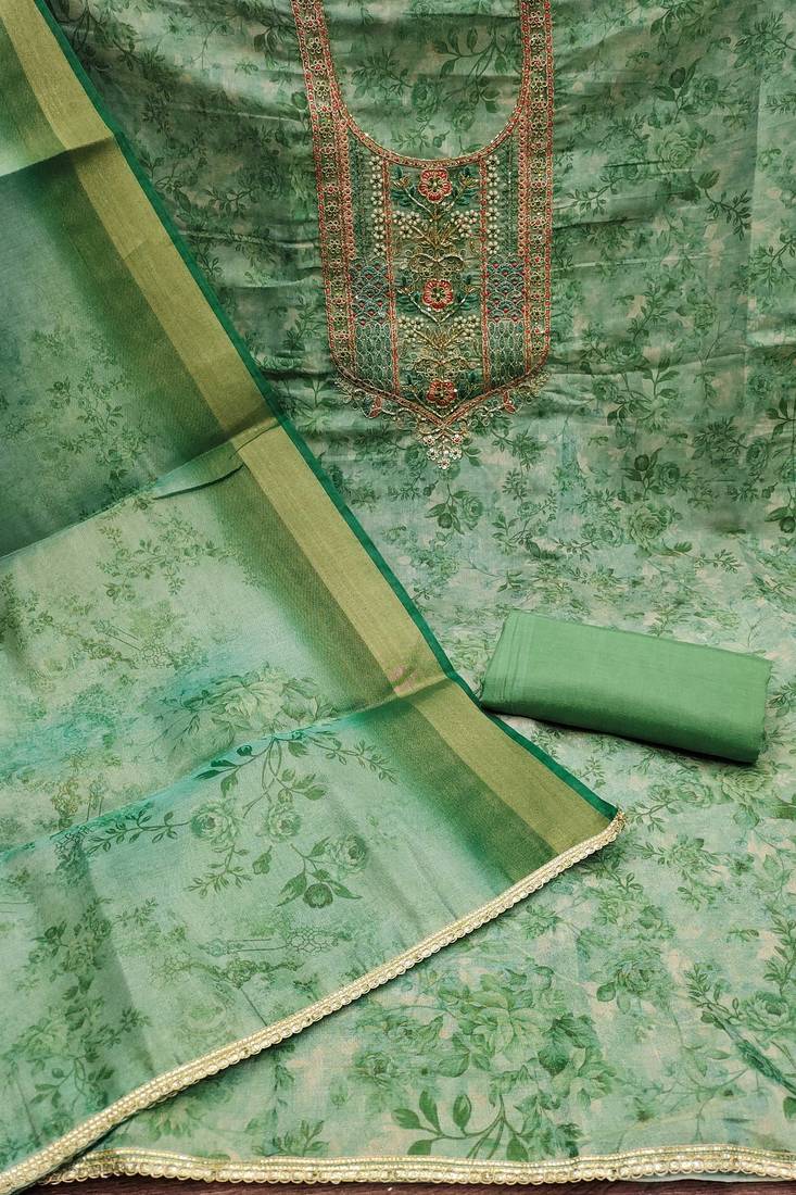 | Product Description | Versatile Designer Print, Heavy Handwork And Fancy Border With Stylish Digital Printed Dupatta Straight Style 2.00 Mtr Unstitched Dress Material Top Of Sea Green Colour Cotton Silk Fabric Also Including 2.40 Mtr Chudidar Style Bottom Piece Material Of Sea Green Colour Dull Santoon Fabric With 2.10 Mtr Dupatta Of Sea Green Colour Cotton Silk Fabric By Shadow & Saining Brand |