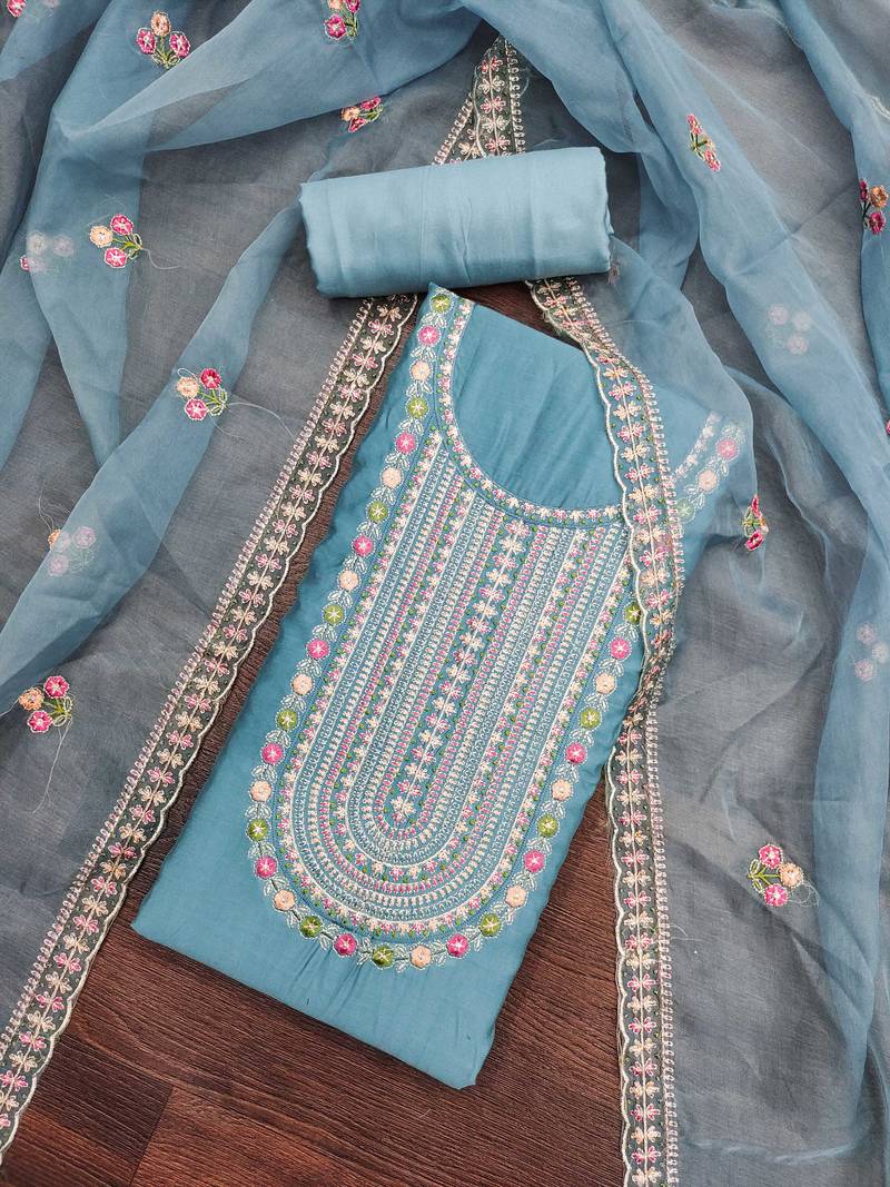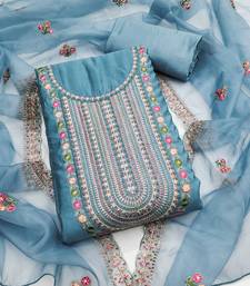 Sky-blue embroidered cotton silk semi stitched churidar dress-materials