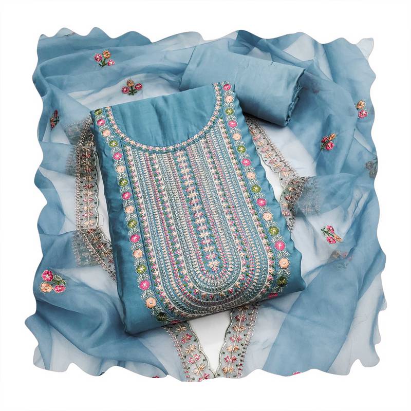 | Product Description | Ethereal Heavy Multi Zari Embroidery And Fancy Border With Embroidered Dupatta Straight Style 2.00 Mtr Unstitched Dress Material Top Of Sky Blue Colour Roman Cotton Silk Fabric Also Including 2.40 Mtr Chudidar Style Bottom Piece Material Of Sky Blue Colour Dull Santoon Fabric With 2.10 Mtr Dupatta Of Sky Blue Colour Organja Fabric By Shadow & Saining Brand |