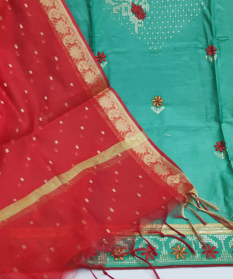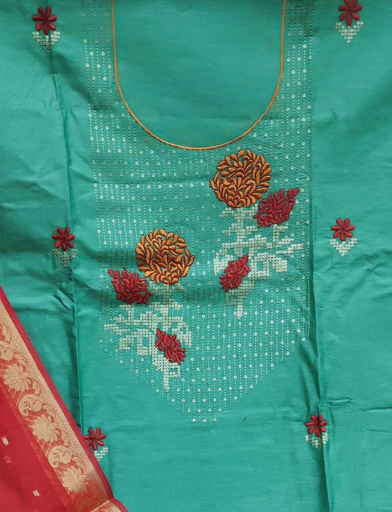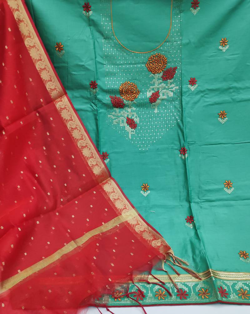 | Product Description | Heavy Multi Embroidery With Fancy Border Straight Style 1.80 Mtr Unstitched Dress Material Top Of Sky Blue Colour Glass Cotton Fabric Suggestable Quarter Style Sleeves And Round Style Neck Also Including 2.00 Mtr Chudidar Style Bottom Material Of Red Colour Cotton Fabric With 2.00 Mtr Dupatta Of Red Colour Banarasi Jacquard Fabric |