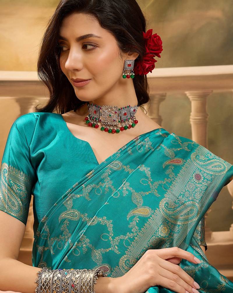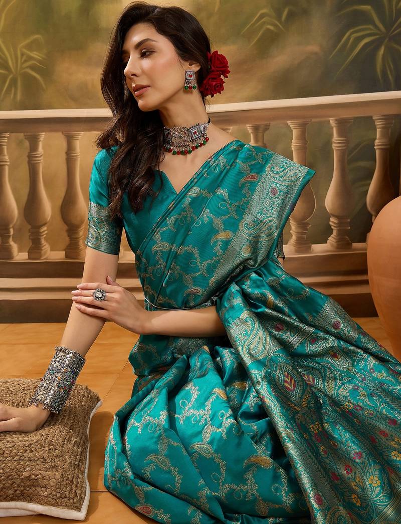 Teal banarasi jacquard saree with rich zari weaving, mina & lace work on pallu