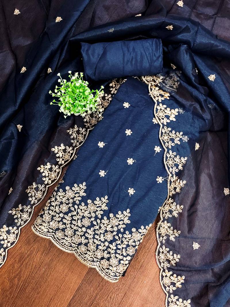 | Product Description | Simplistic Heavy Zari Embroidery And Fancy Border With Designer Embroidered Dupatta Straight Style 1.80 Mtr Unstitched Dress Material Top Of Teal Blue Colour Twill Net Fabric With 2 Mtr Santoon As Lining Inner Fabric Also Including 3.60 Mtr Unstiched Bottom Material Of Teal Blue Colour Santoon Fabric With 2.10 Mtr Dupatta Of Teal Blue Colour Twill Net Fabric By Shadow & Saining Brand |
