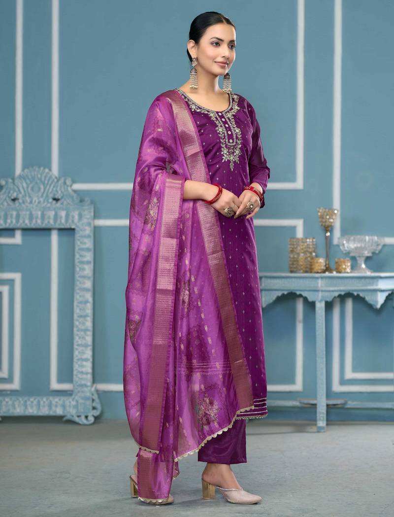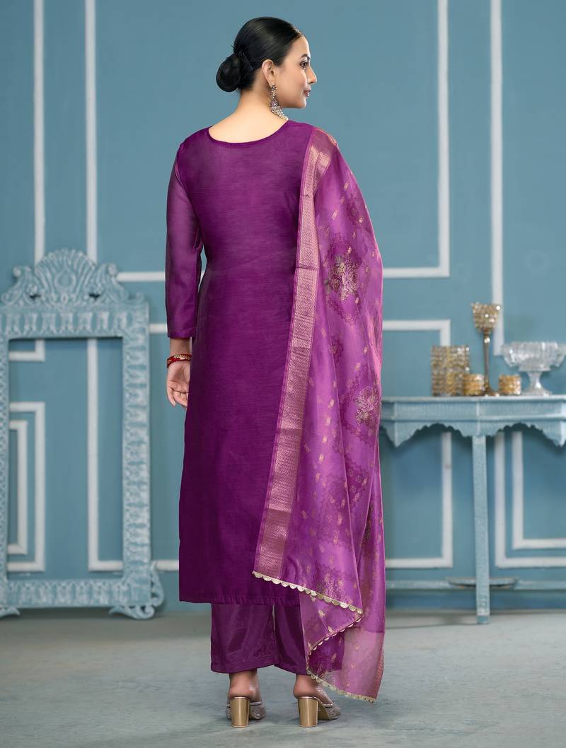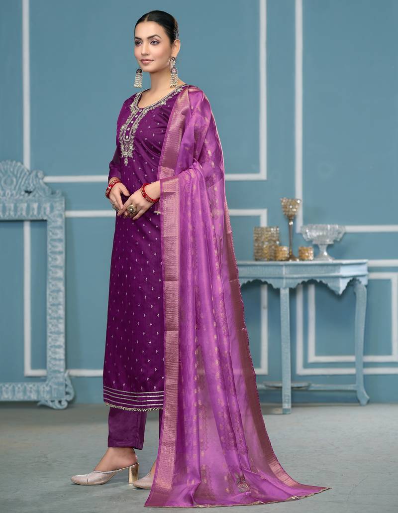 | Product Description | Skin Friendly Designer Weaving And Fancy Handwork With Banarasi Dupatta Straight Style 2.00 Mtr Unstitched Dress Material Top Of Voilet Colour Modal Cotton Fabric With 2 Mtr Dull Santoon As Lining Inner Fabric Also Including 3.80 Mtr Unstiched Bottom Material Of Voilet Colour Dull Santoon Fabric With 2.10 Mtr Dupatta Of Voilet Colour Organza Banarasi Fabric By Shadow & Saining Brand |