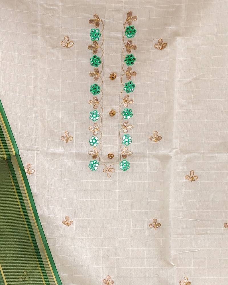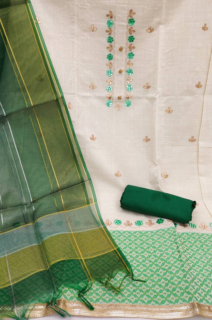 Fancy Gota Work With Weaving Straight Style 1.80 Mtr Unstitched Dress Material Top Of White Colour Cotton Jacquard Fabric Suggestable Quarter Style Sleeves And Round Style Neck Also Including 2.00 Mtr Chudidar Style Bottom Material Of Green Colour Santoon Fabric With 2.00 Mtr Dupatta Of Green Colour Organza Fabric