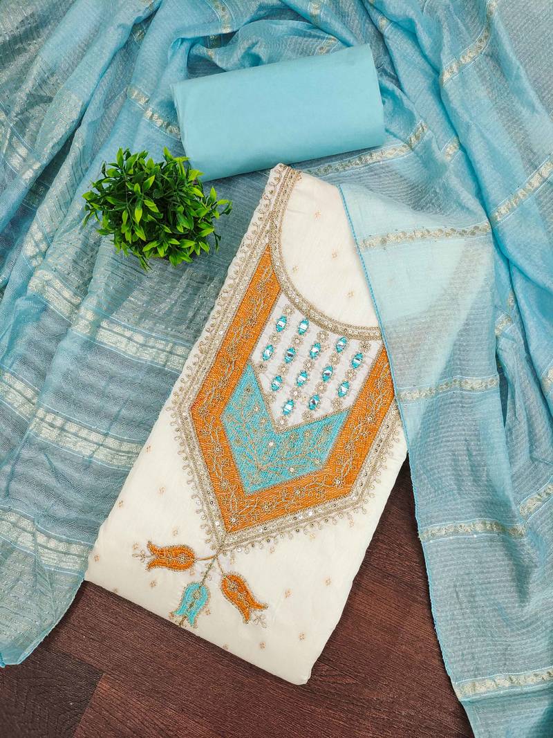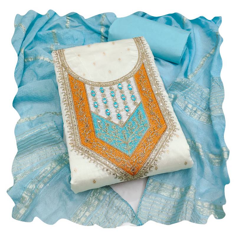 | Product Description | Trendsetting Heavy Weaving Thread Sequence Embroidery And Fancy Border With Designer Woven Dupatta Straight Style 2.20 Mtr Unstitched Dress Material Top Of White Colour Modal Butti Jacquard Fabric With 2 Mtr Santoon As Lining Inner Fabric Also Including 3.60 Mtr Unstiched Bottom Material Of Sky Blue Colour Santoon Fabric With 2.10 Mtr Dupatta Of Sky Blue Colour Modal Jacquard Fabric By Shadow & Saining Brand |