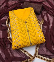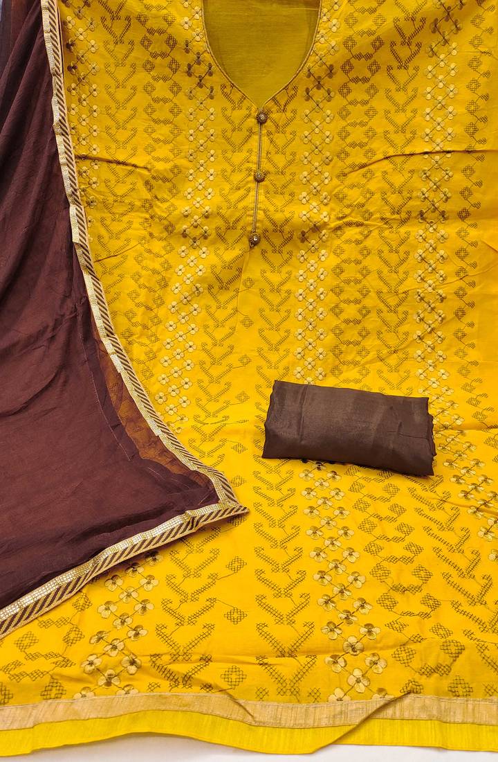 Yellow embroidered chanderi semi stitched churidar dress-materials