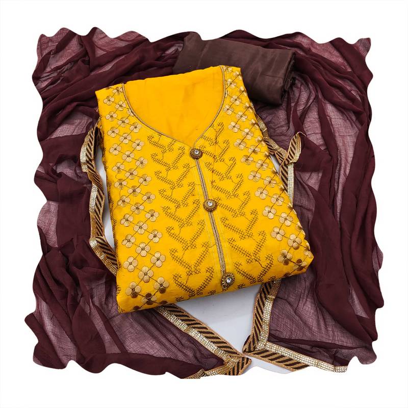Signature Heavy Thread Embroidery And Fancy Border With Designer Dupatta Straight Style 2.00 Mtr Unstitched Dress Material Top Of Yellow Colour Modal Chanderi Fabric Also Including 2.40 Mtr Chudidar Style Bottom Piece Material Of Brown Colour Dull Santoon Fabric With 2.10 Mtr Dupatta Of Brown Colour Nazneen Fabric By Shadow & Saining Brand