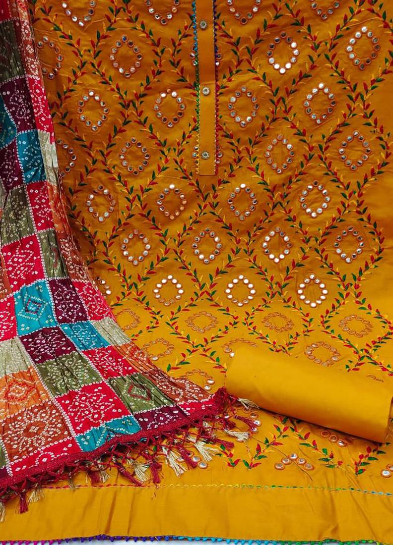 | Product Description | Heavy Multi Thread Embroidery And Mirror Work With Bandhani Print Dupatta Straight Style 1.80 Mtr Unstitched Dress Material Top Of Yellow Colour Cotton Fabric Suggestable Quarter Style Sleeves And Round Style Neck Also Including 2.00 Mtr Chudidar Style Bottom Piece Material Of Yellow Colour Cotton Fabric With 2.00 Mtr Dupatta Of Multi Colour Chinon Fabric |