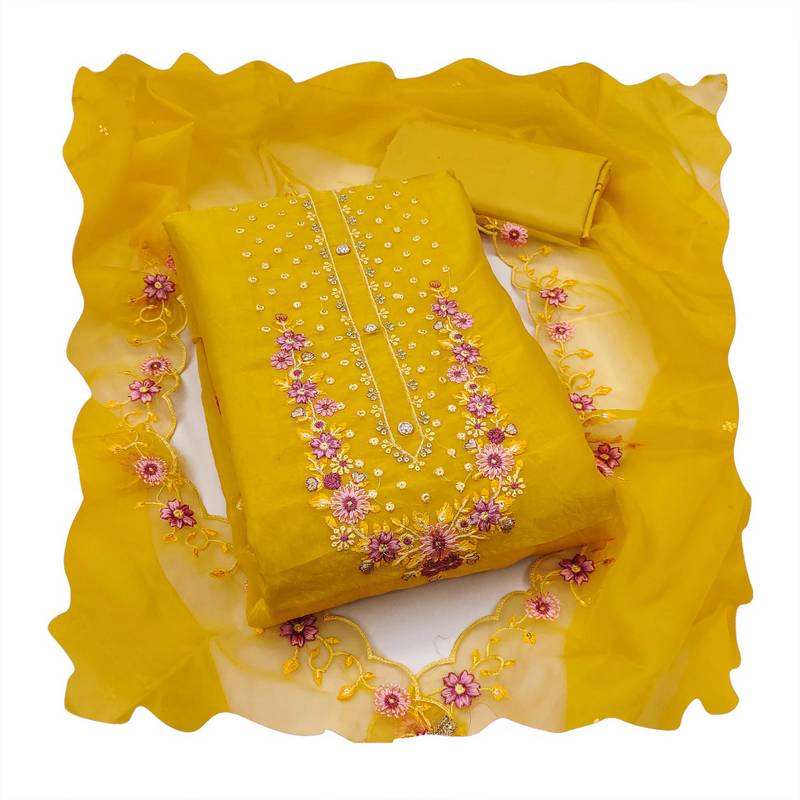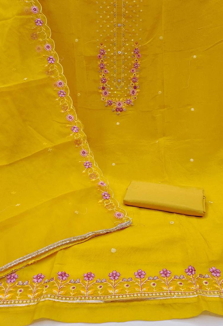 | Product Description | Opulent Heavy Multi Thread Embroidery And Fancy Border With Designer Embroidered Dupatta Straight Style 2.00 Mtr Unstitched Dress Material Top Of Leamon Yellow Colour Viscose Golden Crush Fabric With 2 Mtr Dull Santoon As Lining Inner Fabric Also Including 3.70 Mtr Unstiched Bottom Material Of Leamon Yellow Colour Dull Santoon Fabric With 2.10 Mtr Dupatta Of Leamon Yellow Colour Pure Organja Fabric By Shadow & Saining Brand |