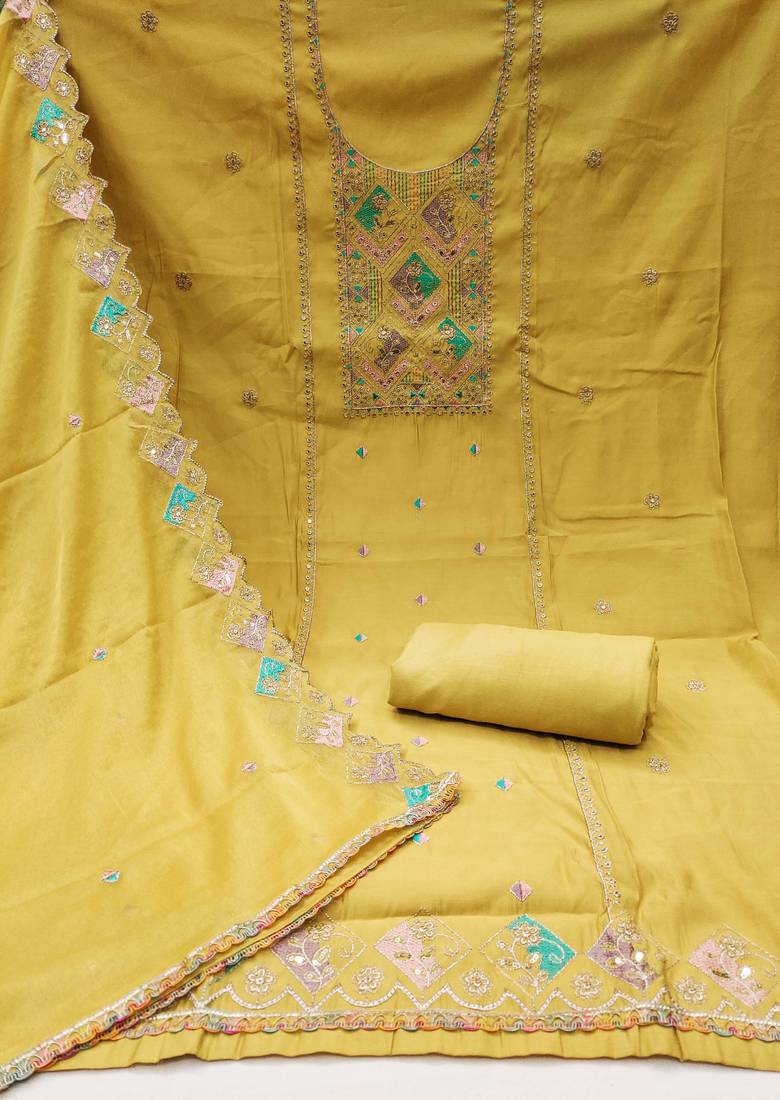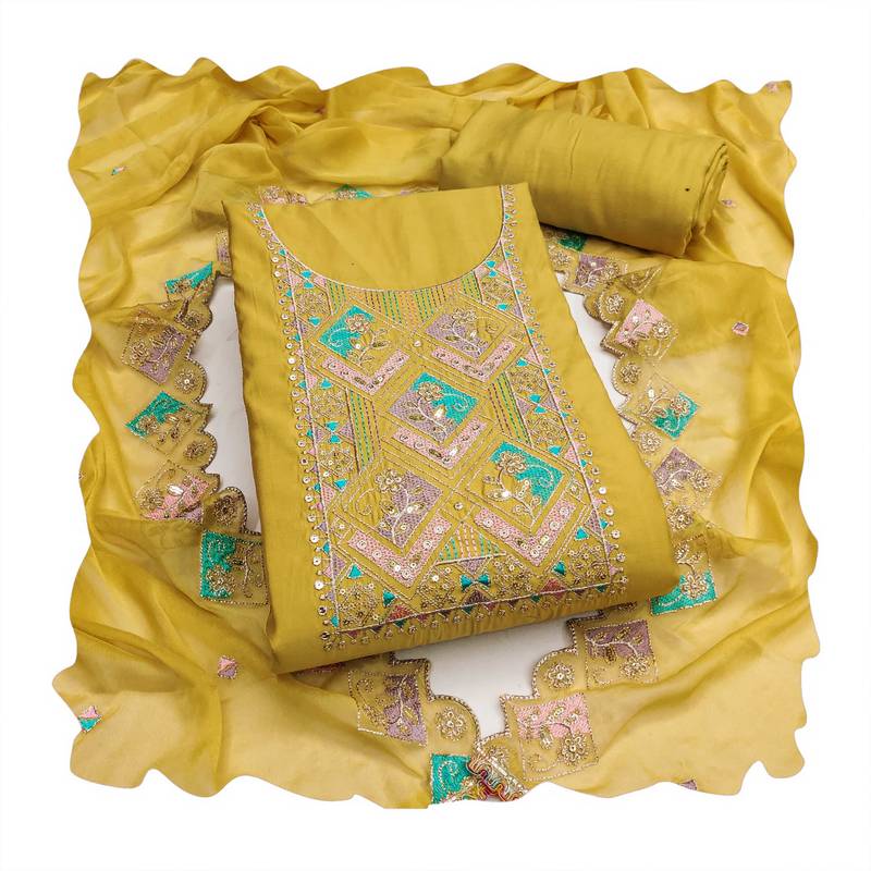 | Product Description | Festive Ready Heavy Thread Sequence Embroidery And Fancy Border With Designer Embroidered Dupatta Straight Style 2.20 Mtr Unstitched Dress Material Top Of Yellow Colour Pure Cotton Silk Fabric Also Including 2.40 Mtr Chudidar Style Bottom Piece Material Of Yellow Colour Rayon Fabric With 2.10 Mtr Dupatta Of Yellow Colour Nazneen Fabric By Shadow & Saining Brand |