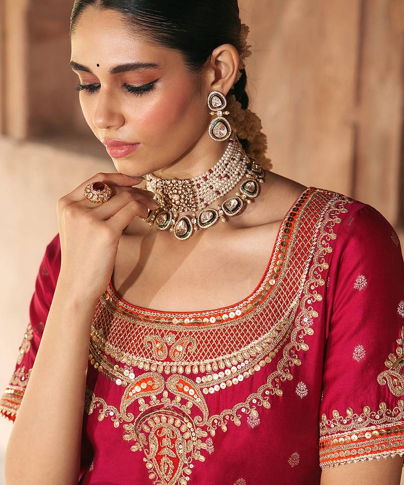 Product Description | This Graceful Ensemble Features A Pure Banarasi Short Kurta With A Broad Deep Scoop Neckline, Zero Back, And Elbow Sleeves. Paired With A Sharara Adorned With A Broad Border And Embroidered Bootis, And A Silk Organza Dupatta, The Set Is Embellished With Kashmiri Tilla And Gota Patti Embroidery, Highlighted With Pearls And Sequins. Finished With Delicate Gota Detailing, This Outfit Exudes Timeless Elegance.