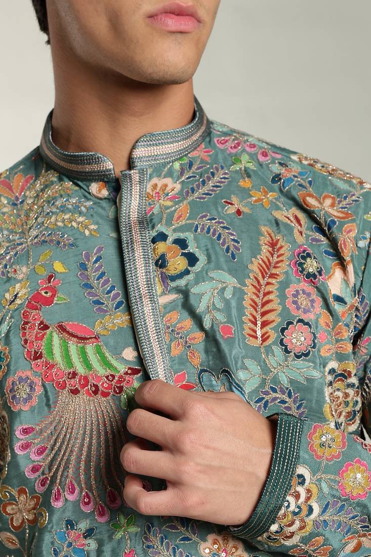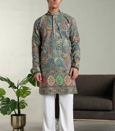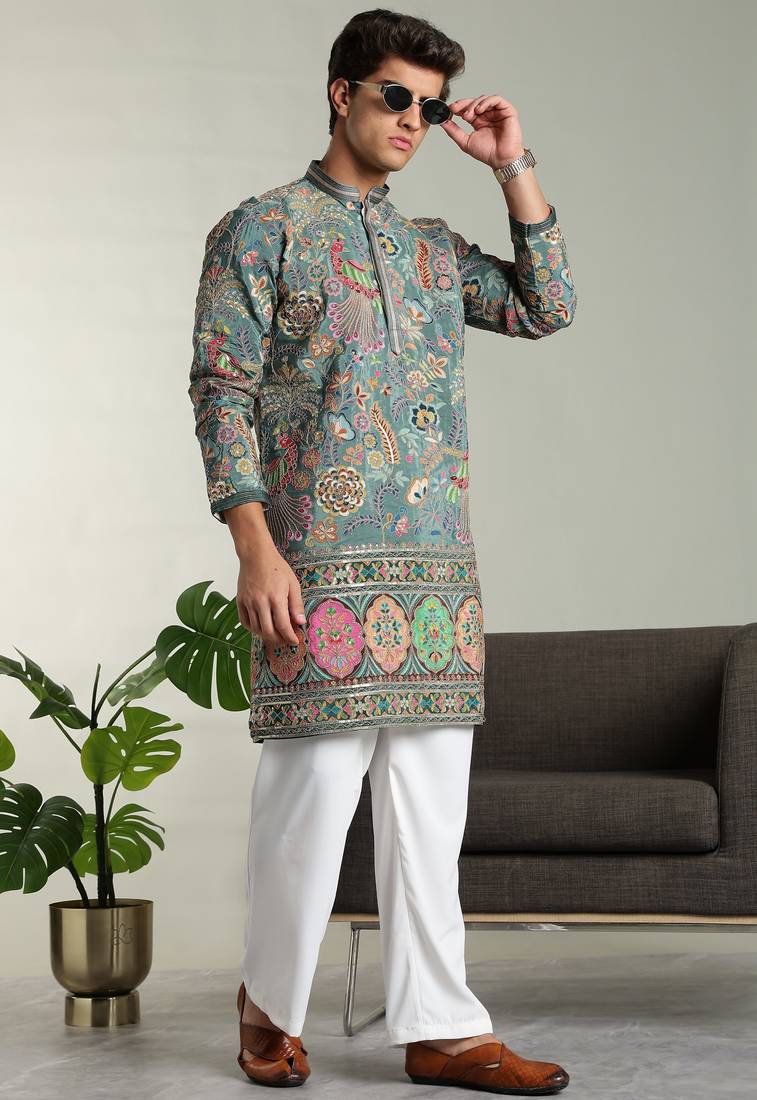 Men's stylish rayon silk sequins position embroidery kurta pant set