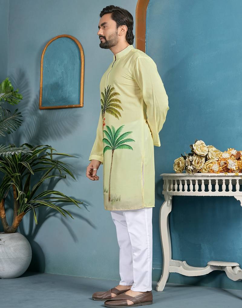 | Product Description | Refresh Your Ethnic Look With This Light Yellow Cambric Cotton Kurta Featuring A Vibrant Palm Tree Print That Adds A Stylish, Tropical Touch. The Soft Fabric Ensures All Day Comfort, Making It A Great Pick For Casual Gatherings, Festive Days, Or Relaxed Celebrations. Its Front Zipper Detail And Clean Silhouette Give It A Modern Finish, While The Playful Print Keeps The Outfit Lively And Unique. Pair It With White Trousers Or Churidar For A Neat And Effortless Look. |