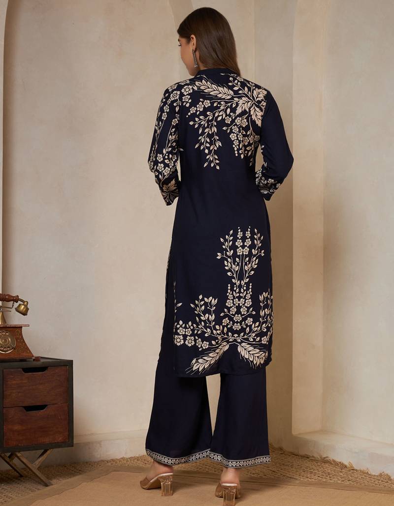 Navy blue printed rayon kurta pant and palazzo set stitched