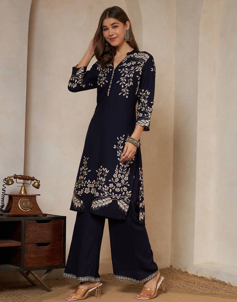 | Product Name | Navy Blue Printed Rayon Kurta Pant And Palazzo Set | |