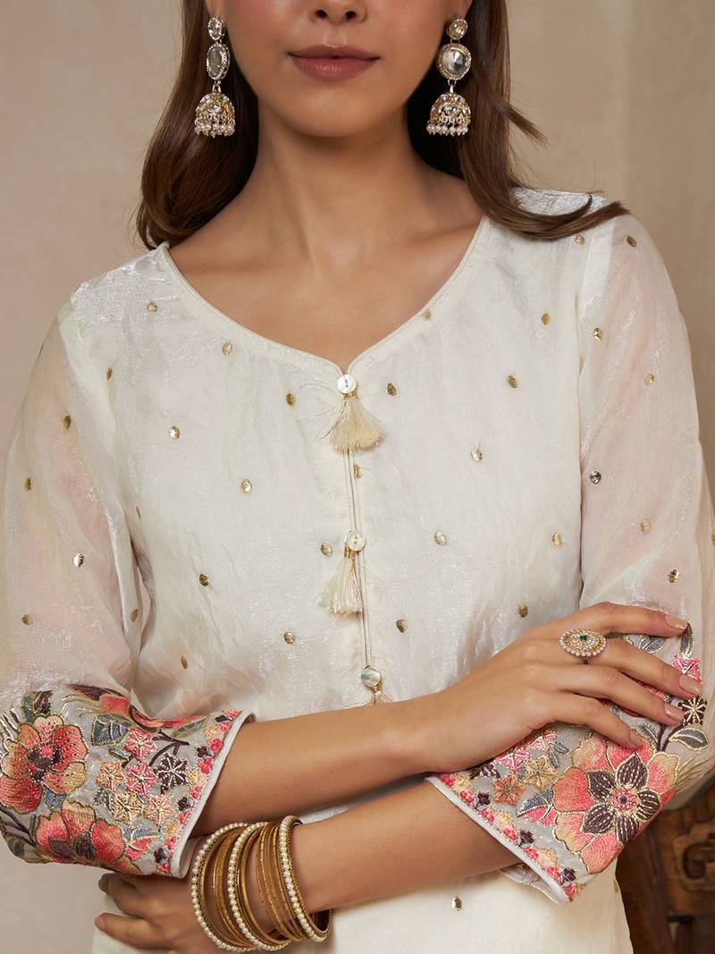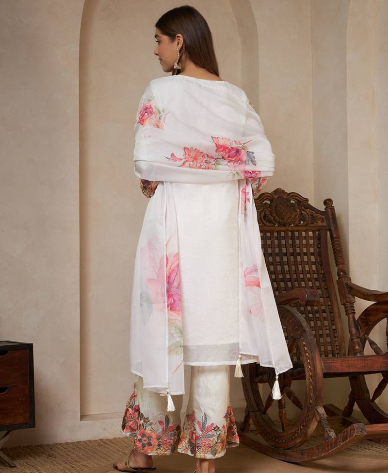 Off white embroidered silk kurta palazzo and dupatta set stitched
