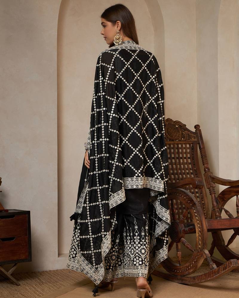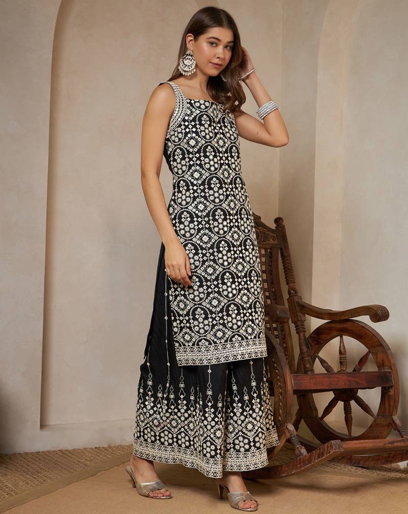 Sparkle black embroidered georgette kurta palazzo and dupatta set stitched