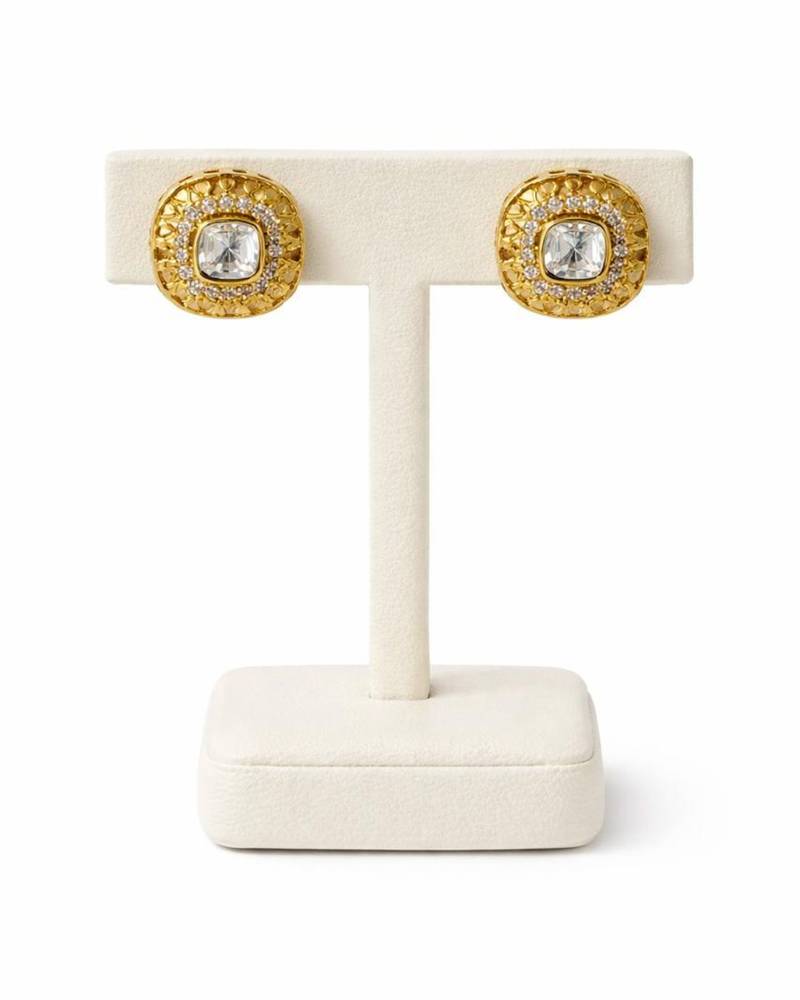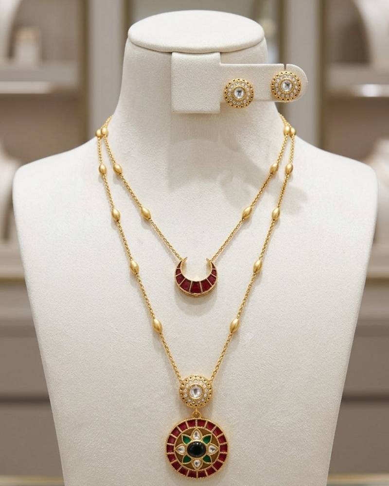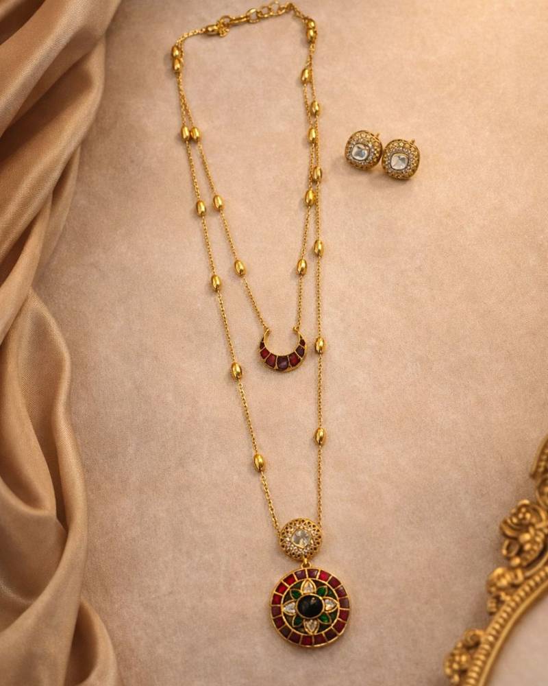 The Noor Dual Layer Kundan Necklace Set Is Designed For Effortless Elegance. Featuring A Delicate Two Layer Chain, The Design Combines A Minimal Crescent Accent With A Classic Kundan Pendant, Creating A Look That Is Both Subtle And Festive.