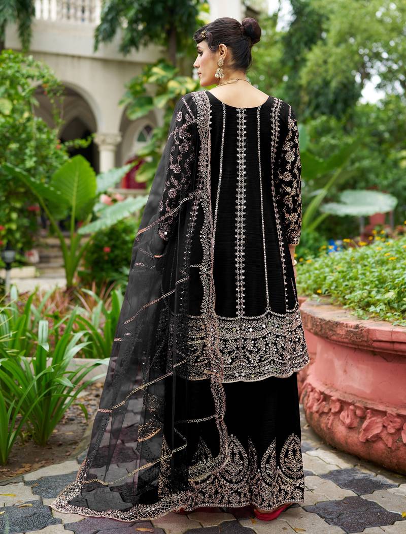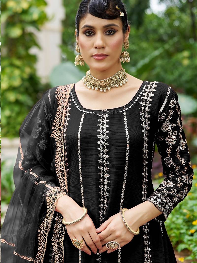 Black real mirror chinon silk wedding party wear sharara salwar suit with net dupatta full stitched free size