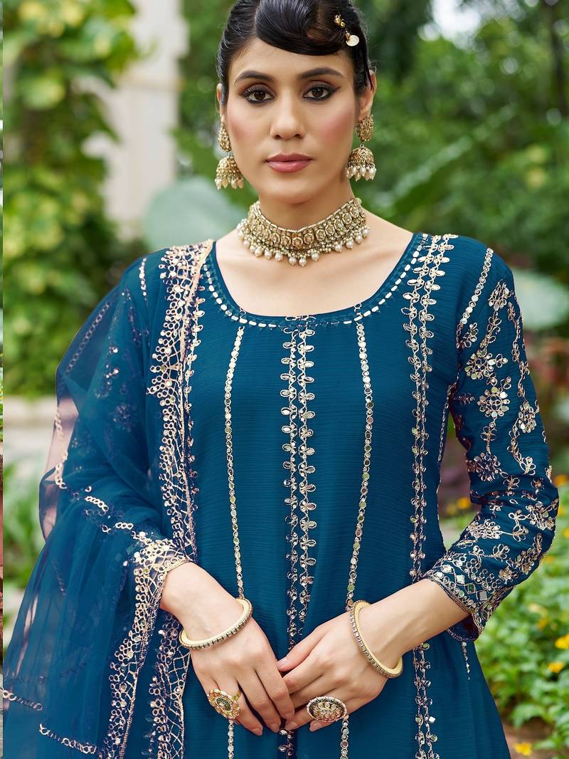 Blue real mirror chinon silk wedding party wear sharara salwar suit with net dupatta full stitched free size