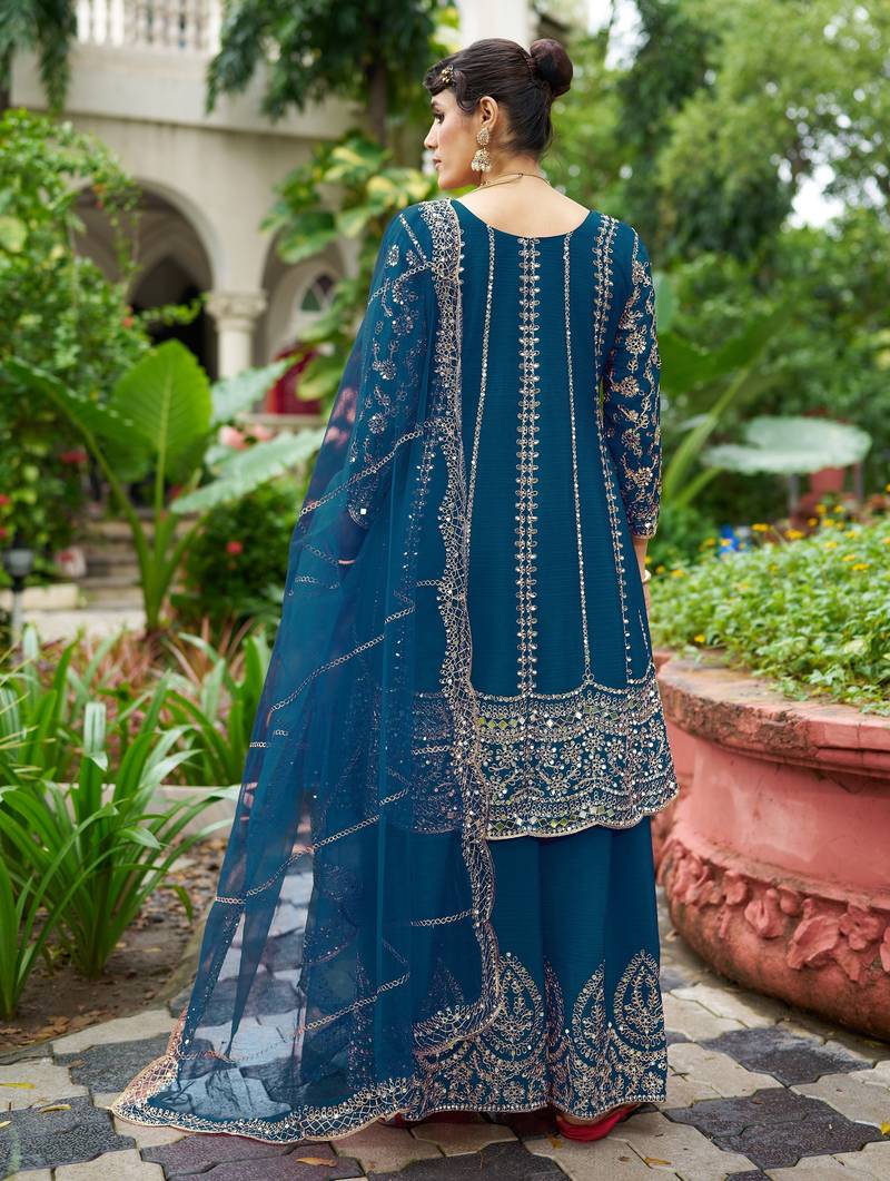 | Product Name | Blue Real Mirror Chinon Silk Wedding Party Wear Sharara Salwar Suit With Net Dupatta Full Stitched Free Size | |