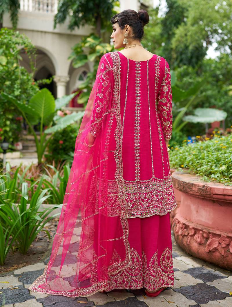 Rani pink real mirror chinon silk full stitched wedding party wear sharara salwar suit with net dupatta